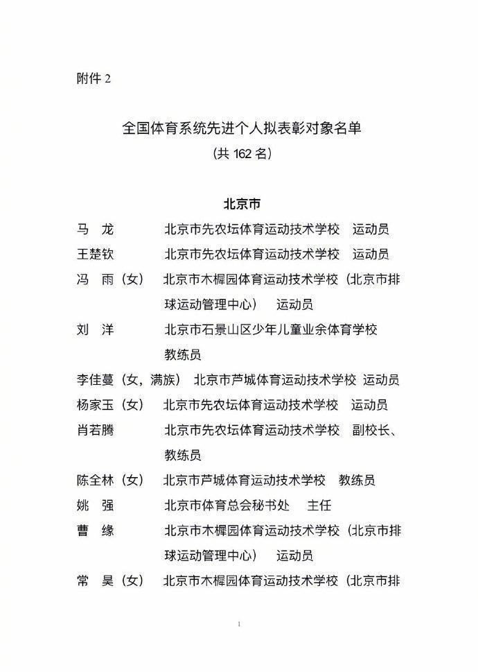 虎扑10月28日讯根据全国体育系统先进集体和先进个人评选表彰工作安排,经逐级推荐和评选,全国体育系统先进集体和先进个人评选表彰工作领导小组审核,拟表彰全国体育系统先进集体67个、先进个人162名。